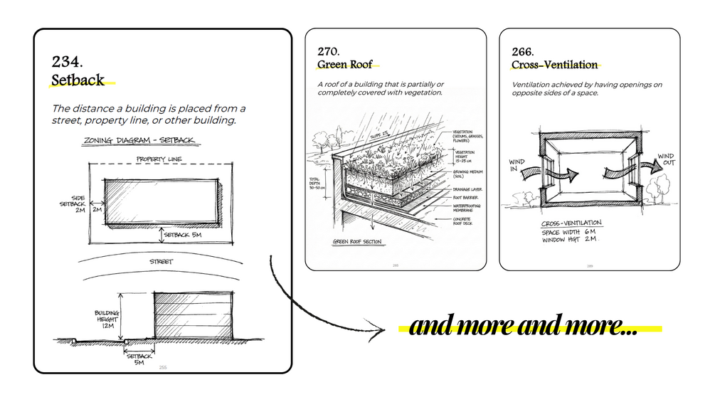 Key concepts to make designs clear: scale, massing studies, diagrams, hierarchy, building codes, zoning, and much more.